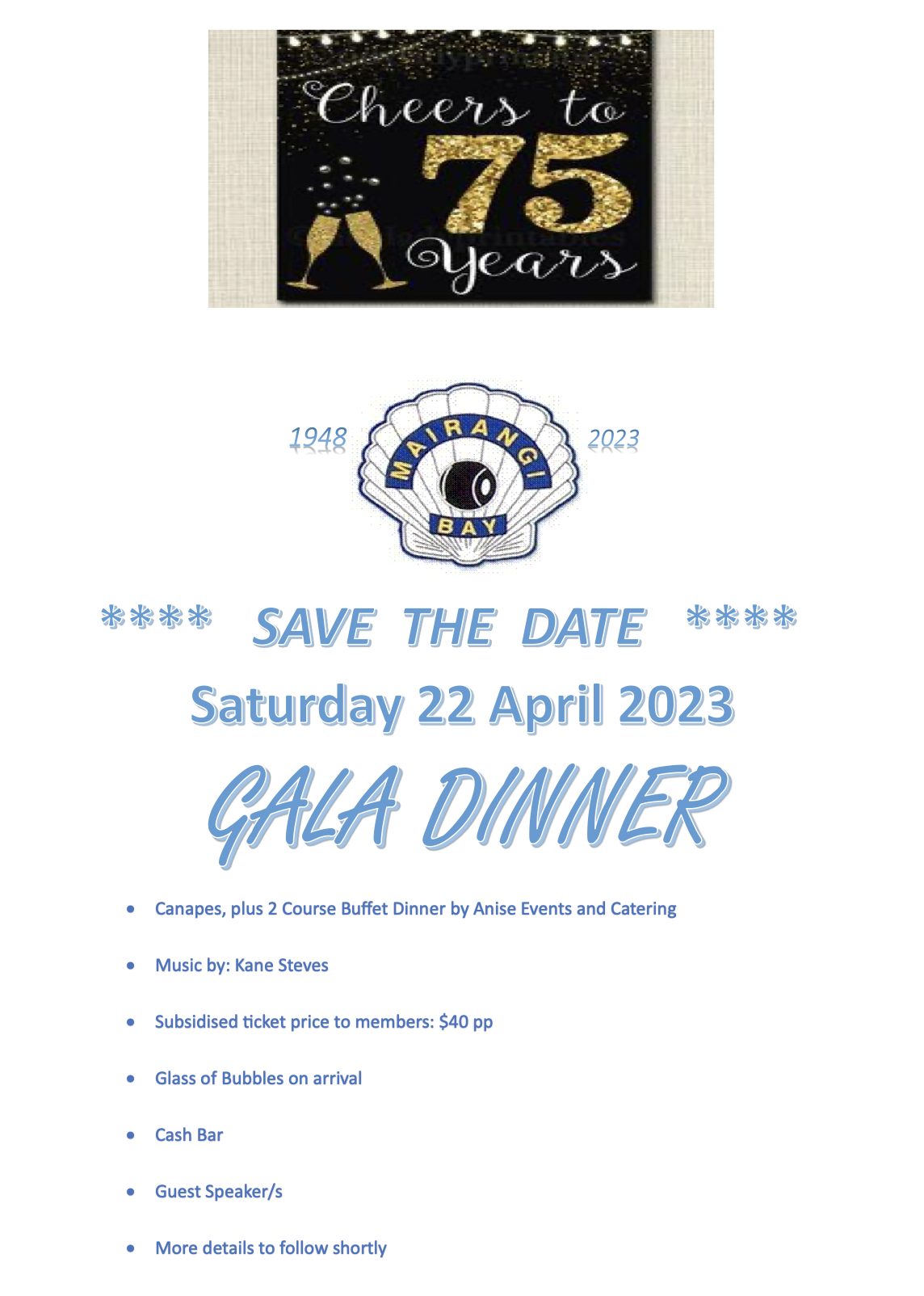 I have attached a flyer promoting our 75th Gala dinner. Yes we are 75 years old and we are going to celebrate this with a Gala dinner, details on the flyer, please note the club is subsidising this event to make it more affordable for all.