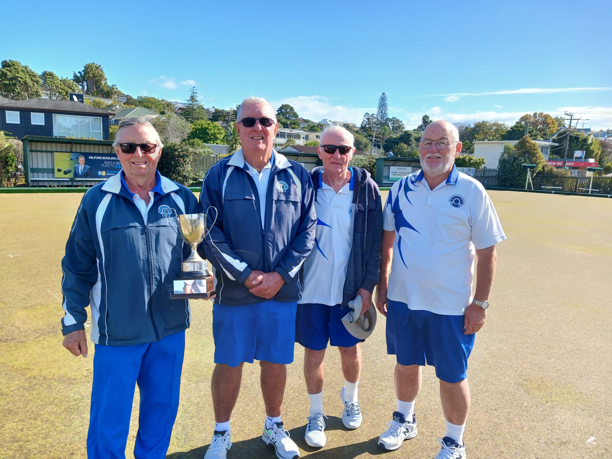 Sharks: Ian Coombe, Kevin Cameron, Gordon Jenkins (replacing the unavailable Bruce McClintock) and Allan Langley. They won their quarter final 16-13 against Milford in a tight game. In the semifinal, they played Orewa. Orewa led 19-7 but Mairangi fought back to lead 20-19, in the last end the Sharks gained one bonus point but Wayne Harris the skip for Orewa drew two shots to draw 21 all. In an extra end Mairangi Bay claimed the win 25-21.