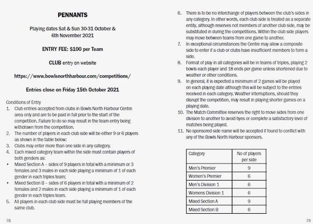 Playing dates for the Bowls North Harbour Pennants competition are currently Saturday 30th, Sunday 31st and Saturday 6th November 2021.