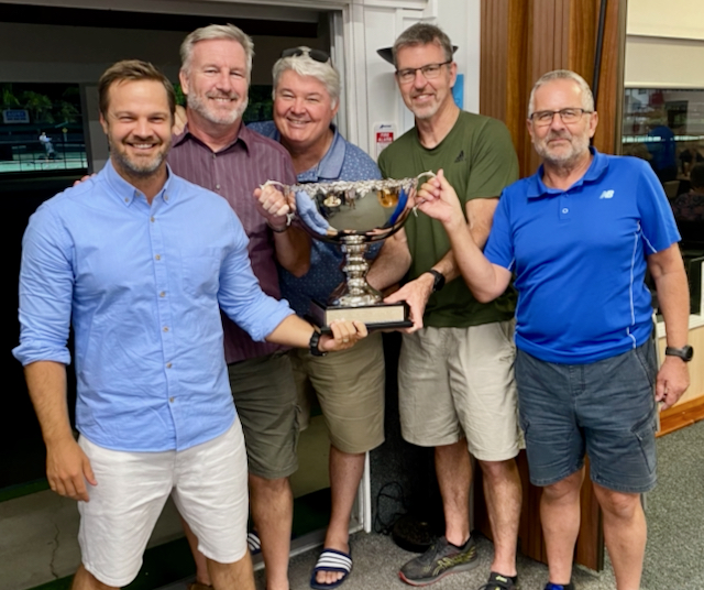 Pictured are the winning team of Paul Dean, Warren Suttie, Grant Watson and Glen Godfrey named “The Jack Reachers”. The team is pictured with the Rex Redfern Memorial Bowl, a magnificent trophy donated in memory of club Life Member Rex Redfern, who passed away last year. Simon O’Connor the owner of Sentinel Planning and a long term participant in social bowls at the club who donated the trophy, said the size of the trophy is in keeping with Rex’s larger than life personality. Rex’s son John Redfern and daughter – in – law Jo Redfern presented the trophy to the winners.