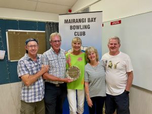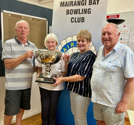 Pictured with the Rex Redfern Memorial Bowl is the winning team; The Jokers. The team members are John Myers, Bev Calder-Mayers (the organiser), Barbara Brown and John Weir.