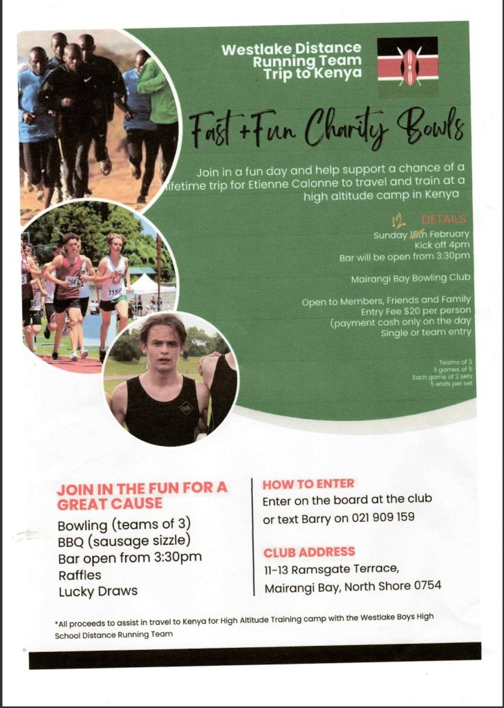 Join in a fun afternoon of fast fun bowls and help support the Westlake Boys High School running team and Etinenne Calonne with his trip to Kenya. Barry McCrystal has organised this fun afternoon of bowls which is open to all: current bowlers, new bowlers, family and friends. All proceeds go to assist travel to Kenya to the high altitude training camp with the Westlake Boys High School distance running team.