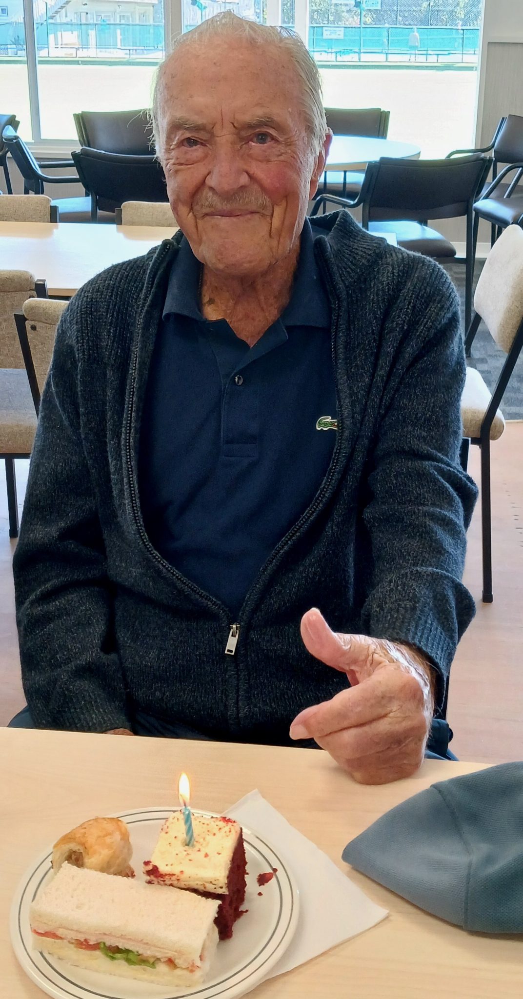 At yesterday’s triples we had a celebratory morning tea to celebrate the 99th birthday of our legend bowler John Miles.  His actual birthday was on Monday so we organised a lovely day and a surprise morning tea.  Caryl joined John for the morning tea which also was a nice surprise.