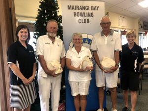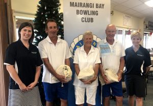Another day of ideal bowling condition with a little breeze and superb greens saw a big field take part in the Any Combination, Open Triples: a ham tournament sponsored by QUAY Travel. We welcomed teams from other clubs and were delighted to be joined by two visitors from Mangawhai: Terry Cathcart and Steve (originally from Newcastle). Some members may remember that Terry completed his first five years as a member of the Mairangi Bay Bowling Club before he moved north. They were hosted by Ian Baxter and said that they enjoyed the day and the friendly welcome they received. They promised to be back.