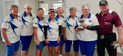 Our women’s team, the Pearls, were striving for back-to-back wins.  The team was : Singles -Theresa Rogers,  Pairs – Elaine McClintock and Kerin Roberts,  Fours – Sheryl Wellington, Jan Gledhill, Colleen Rice and Julie Chhour with Lorna Donald reserve and marker.